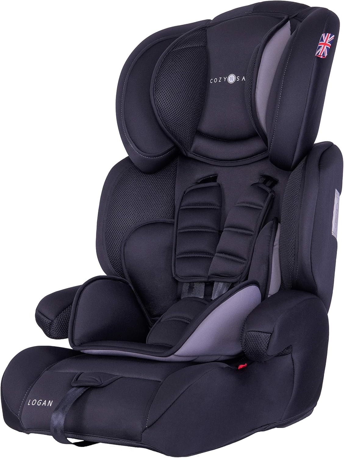 Supports 9–36 kg (approx. 9 months to 12 years).5-point harness and side-impact protection.